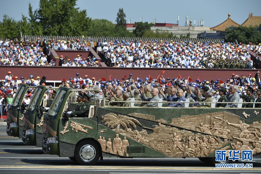 9月3日,中国人民抗日战争暨世界反法西斯战争胜利70周年纪念大会在北京隆重举行。这是抗战老兵乘车方队。 新华社记者 彭昭之 摄