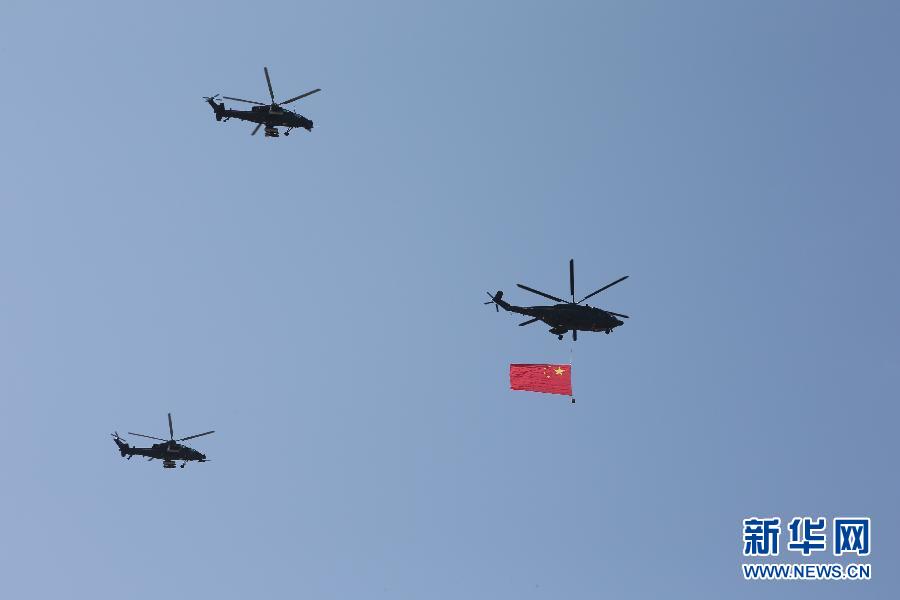 9月3日,中国人民抗日战争暨世界反法西斯战争胜利70周年纪念大会在北京隆重举行。这是空中护旗方队通过天安门广场。 新华社记者李刚摄