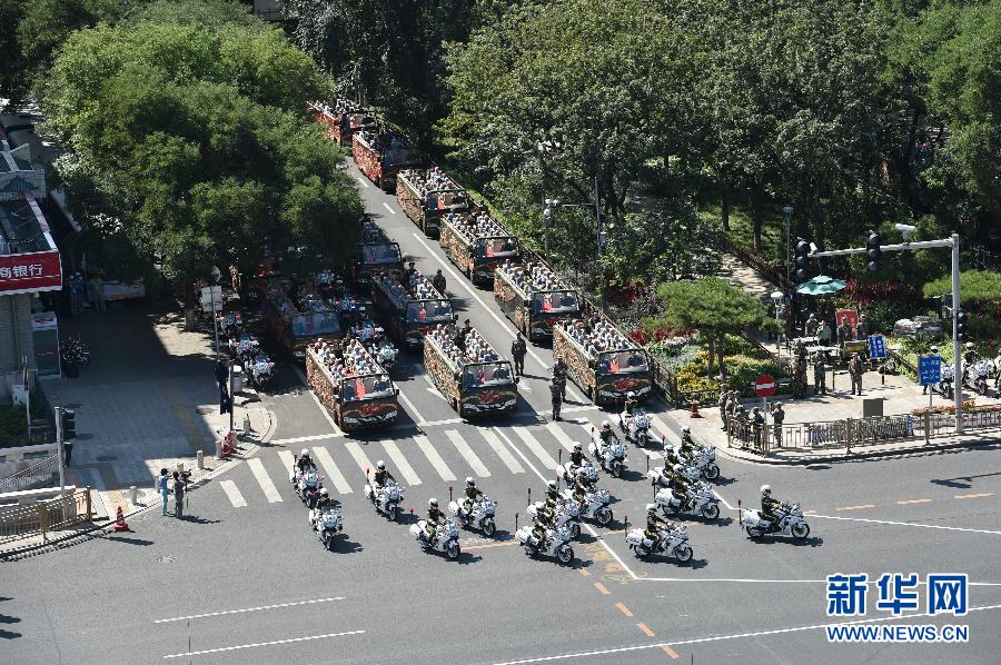 9月3日,中国人民抗日战争暨世界反法西斯战争胜利70周年纪念大会在北京隆重举行。这是抗战老兵乘车方队、抗战支前模范乘车方队在受阅前准备。新华社记者 赵颖全 摄
