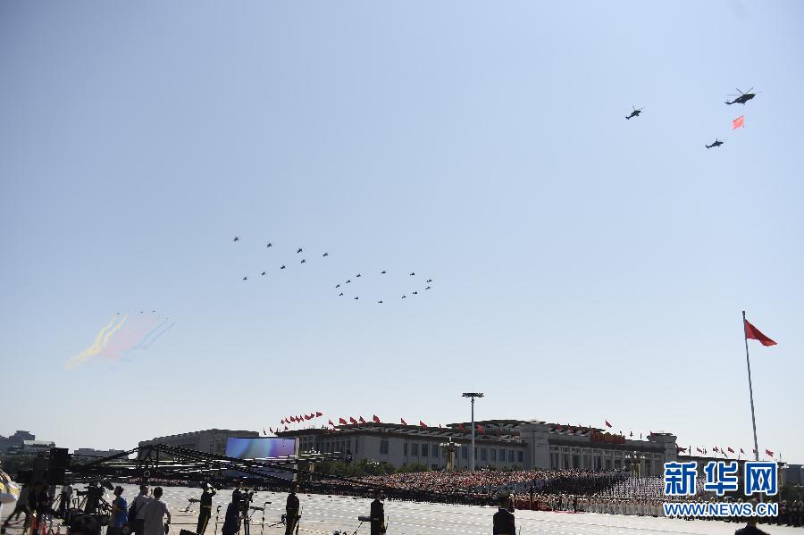 9月3日,中国人民抗日战争暨世界反法西斯战争胜利70周年纪念大会在北京隆重举行。这是空中护旗方队通过天安门广场。 新华社记者燕雁摄
