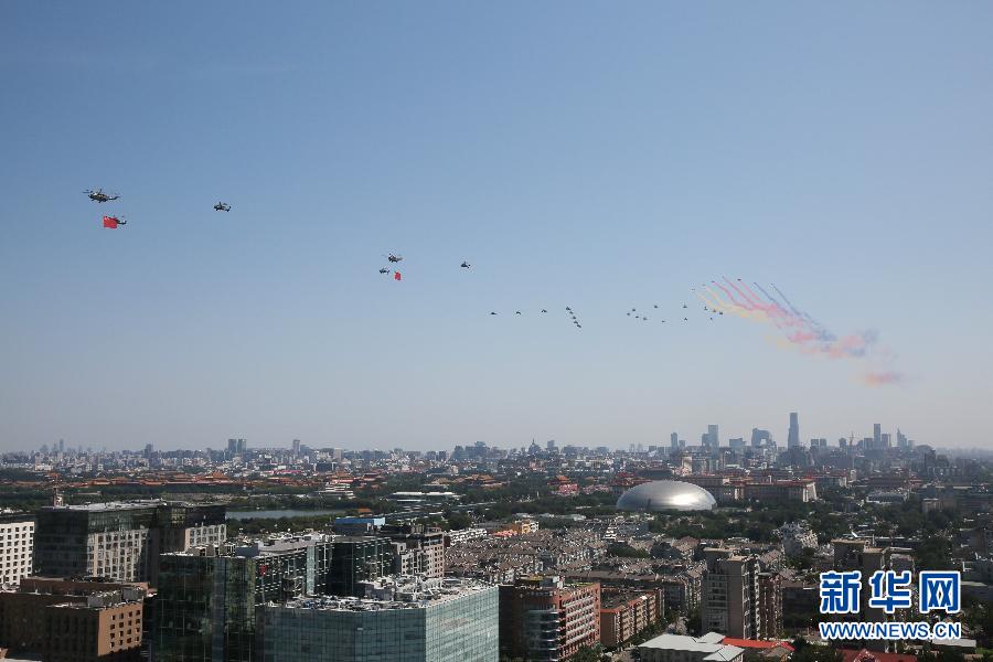 9月3日,中国人民抗日战争暨世界反法西斯战争胜利70周年纪念大会在北京隆重举行。这是空中护旗方队飞过天安门广场。 新华社记者 袁满 摄