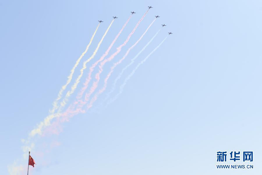 9月3日,中国人民抗日战争暨世界反法西斯战争胜利70周年纪念大会在北京隆重举行。这是空中护旗方队的7架教练机拉出七道彩带通过天安门广场。新华社记者公磊摄
