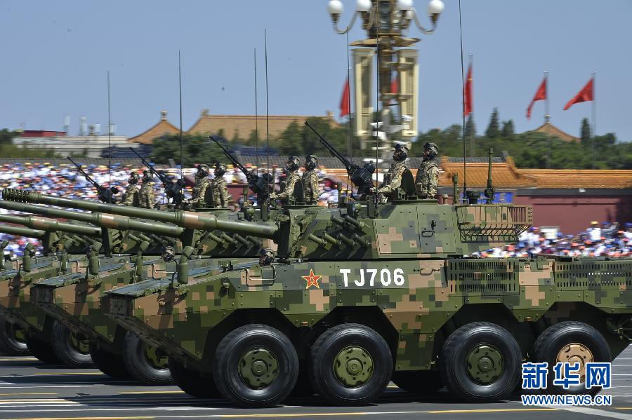 9月3日,中国人民抗日战争暨世界反法西斯战争胜利70周年纪念大会在北京隆重举行。这是轮式装甲突击车方队接受检阅。 新华社记者 彭昭之摄