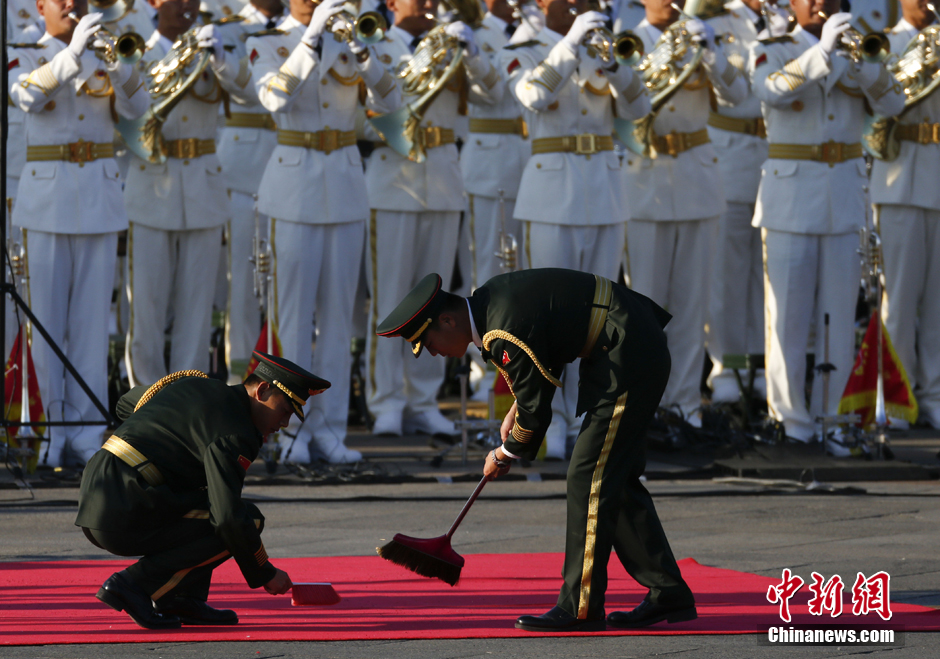 士兵打扫红毯。中新社记者 杜洋 摄