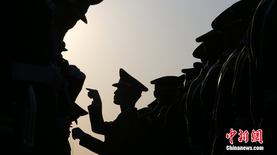 阅兵开始前,士兵互相整理军装。 中新社记者 杨可佳 摄
