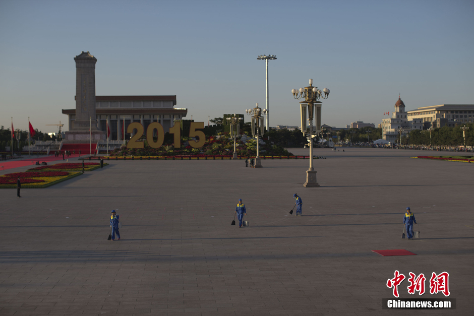 工作人员在纪念中国人民抗日战争暨世界反法西斯战争胜利70周年大会开始前清洁广场。中新社记者 刘关关 摄