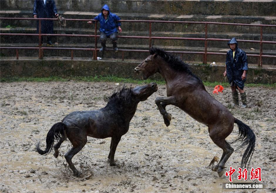 9月3日,广西三江侗族自治县举办首届斗马节。来自广西柳州、融水苗族自治县等地的近30匹雄马在三江侗乡鸟巢竞技场展开的激烈争斗,吸引不少游客前来观看。斗马是由人们牵一匹雌马挑逗两匹雄马,为获得接近雌马的机会,两匹雄马向对方扑去互相厮斗一决胜负。龚普康 摄