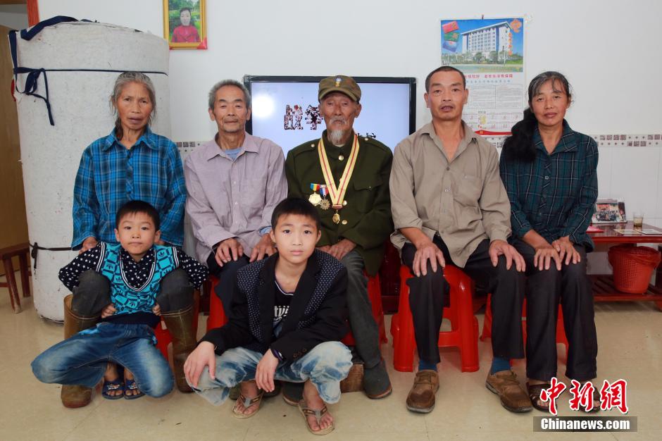 9月3日上午,中国纪念抗日战争胜利70周年阅兵式在北京天安门广场举行。湖南汝城县小垣瑶族镇101岁瑶族抗战老兵李名清一家祖孙四代围坐在电视前,观看阅兵仪式。老人说,祖国现在越来越强大了,能够成为见证者感到很幸运。李名清1936年入伍,在部队时叫李鸿飞,所在军队为陆军十八军14师83团。他在广东省乐昌县入伍后经郴州、汉口再到陕西,然后转至湖南桃源受训。1937年,李名清所在部队在上海与日军激战一个多月。李名清相继参加了常熟、罗定、刘行等战役,后因伤势过重于1939年6月复员回家。老兵的儿媳朱冬花介绍,李名清现在耳清目明、精神矍铄,平时就爱看新闻和抗战剧。今天举行抗战胜利70周年大阅兵,老人心情特别激动,早起穿好了军装,佩戴勋章,等待阅兵开始。阅兵开始后,他叫上家人一起坐在电视机前观看。每当响起敬礼指令时,老人都不由自主,满怀热情的举手敬礼。李名清老人说:“现在祖国越来越强大,人民的生活越过越好了。我有能活到今天,成为见证者,很幸运。”令老人十分骄傲的是,老人孙子李祖丙,也于2010年入伍,现为武警河南省总队士官。 安新志 摄