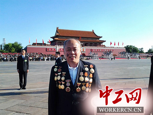 全国劳动模范智呼声在天安门阅兵式现场拍照留念。