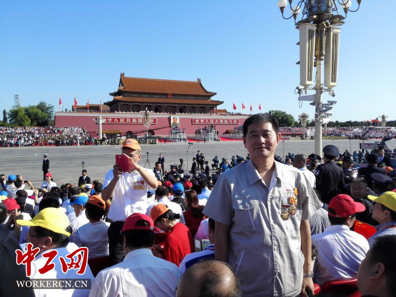 河北钢铁集团唐山钢铁集团有限责任公司首席操作技能专家郑久强刚到观礼台,就让别人帮忙拍下了一张照片。