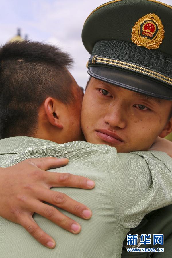 9月4日,一名退伍老兵和战友告别。当日下午,武警肃南森林大队20名老兵踏上了返乡的路途,开始新的人生旅程。 新华社发(张小军摄)