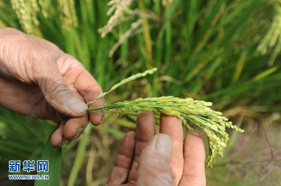 9月6日,安徽省合肥市长丰县岗集乡张庙村农民丁忠书展示灌浆不结实的稻穗。据安徽省物价局介绍,受不利天气等因素的影响,该省今年早籼稻单产减少,种植收益下降。安徽早籼稻主产区自5月下旬开始便受持续低温阴雨的影响,导致早籼稻发育进程变缓,灌浆不结实。在成熟收获期又遭遇强台风暴雨等不利因素的影响,造成谷粒不饱满,部分产区的稻穗还出现倒伏,致单产下降。 新华社发(杨晓原 摄)