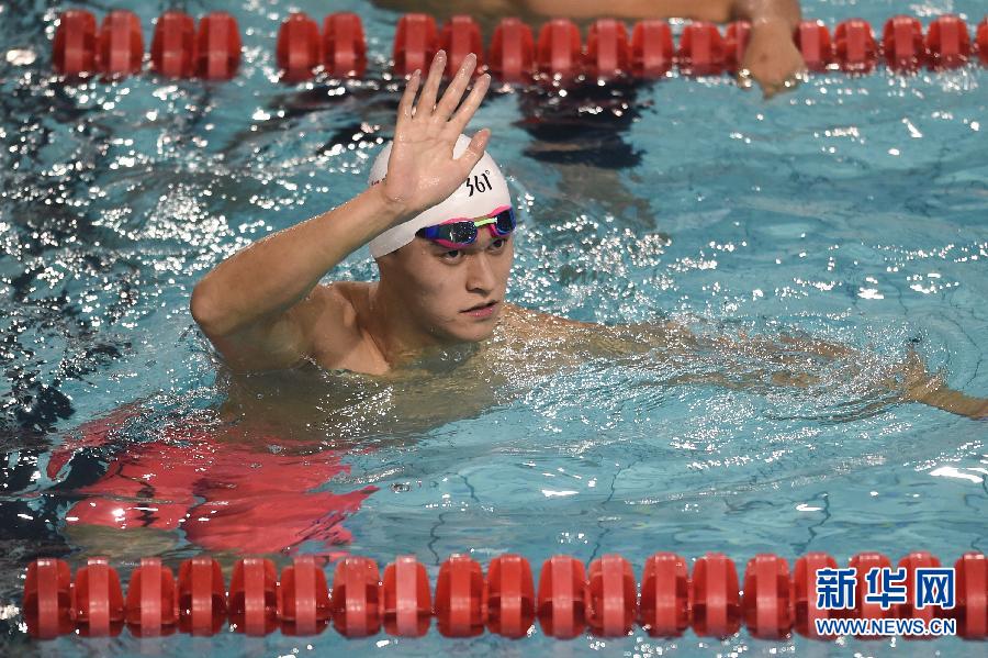 9月6日,孙杨在比赛后向观众挥手致意。当日,在2015全国游泳锦标赛男子1500米自由泳决赛中,浙江队选手孙杨以15分12秒89的成绩夺得冠军。新华社记者杜宇摄