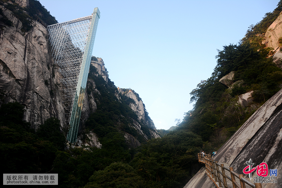 垂直观光电梯依山体垂直建设,位于天堂寨景区海拔1080米的小华山一线天悬空崖壁处。中国网图片库