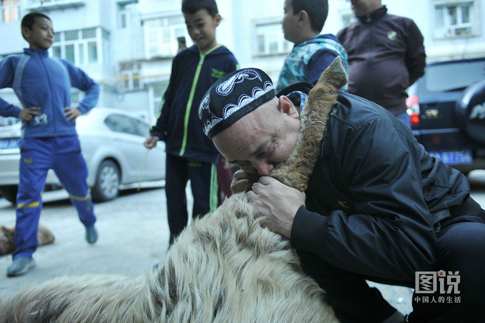 由于是节日的传统项目,伊力扎提和他父亲宰羊动作很娴熟,为了方便剥皮,伊力扎提对着羊皮用力地吹气。“羊肉虽好吃,但剥皮实在太不容易了。”伊力扎提说。