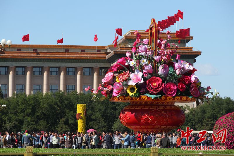 10月1日,天安门广场中心花坛在国庆假期第一天迎来首批外地游客。今年广场中心花坛主题为“祝福祖国”,沿用了大型花篮造型。在花材选取上,首次采用了中国传统十大名花,包括牡丹、月季、梅花等。