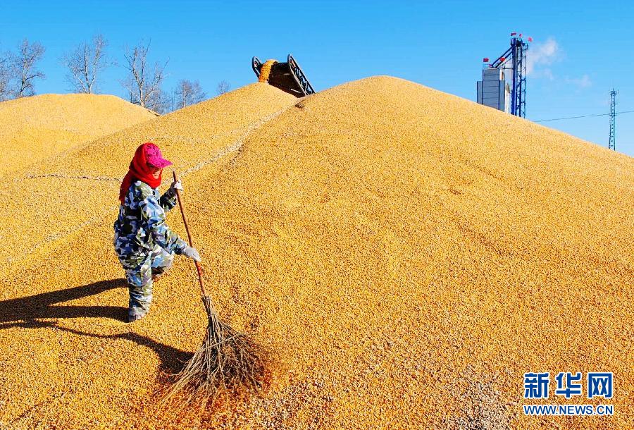 10月18日,黑龙江垦区五大连池农场烘干厂工人在管理烘干后的玉米。为确保秋收顺利进行,黑龙江垦区所属农场10月以来陆续起动了380多座烘干设备,采取昼夜烘干等措施,保证新粮干燥入库,安全存储。新华社发(陆文祥 摄)