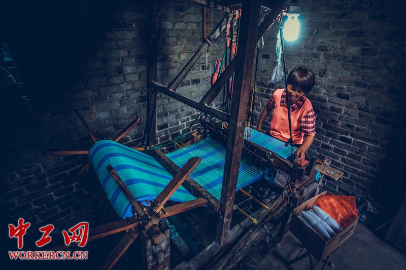 丁村——人类考古史上闻名遐迩的民俗村落。在曾经出土丁村人古人类化石的河滩上,白色的贝壳依稀可寻,人们开辟成良田种粮种棉、栽树育果。丁字形状的路口,不时有牛车驶过,胡同深处、农家院旁,黑色黄色的牛或卧或站。在一派自然祥和中,勤劳的农民在古朴的小院里休养生息,更令人惊喜的是,丁村至今还可以坐看妇女“当户织”、听闻“轧轧”机杼声,沿袭着北方劳动人民许多古老的生产方式。图为丁村的织布女人。 中工网记者 张起晨摄