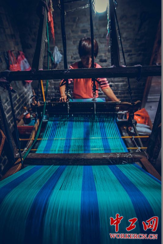 丁村——人类考古史上闻名遐迩的民俗村落。在曾经出土丁村人古人类化石的河滩上,白色的贝壳依稀可寻,人们开辟成良田种粮种棉、栽树育果。丁字形状的路口,不时有牛车驶过,胡同深处、农家院旁,黑色黄色的牛或卧或站。在一派自然祥和中,勤劳的农民在古朴的小院里休养生息,更令人惊喜的是,丁村至今还可以坐看妇女“当户织”、听闻“轧轧”机杼声,沿袭着北方劳动人民许多古老的生产方式。图为丁村的织布女人。     中工网记者  张起晨摄
