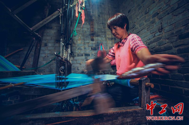 丁村——人类考古史上闻名遐迩的民俗村落。在曾经出土丁村人古人类化石的河滩上,白色的贝壳依稀可寻,人们开辟成良田种粮种棉、栽树育果。丁字形状的路口,不时有牛车驶过,胡同深处、农家院旁,黑色黄色的牛或卧或站。在一派自然祥和中,勤劳的农民在古朴的小院里休养生息,更令人惊喜的是,丁村至今还可以坐看妇女“当户织”、听闻“轧轧”机杼声,沿袭着北方劳动人民许多古老的生产方式。图为丁村的织布女人。     中工网记者  张起晨摄
