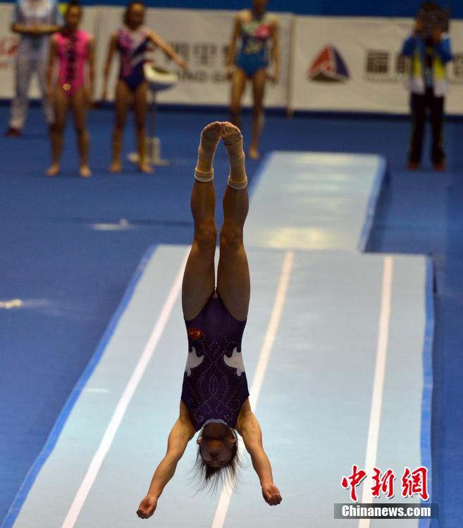 10月20日,中国首届青运会蹦床比赛男女团体决赛在福建师范大学体育中心体育馆举行。经过激烈角逐,福州队包揽男女团体决赛冠军。图为福州队选手在女子单跳比赛中精彩亮相。 刘可耕 摄