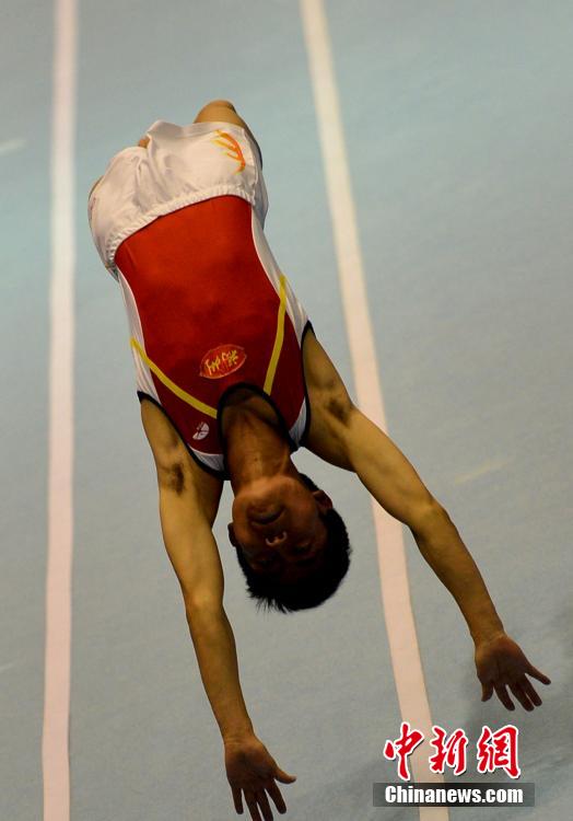 10月20日,中国首届青运会蹦床比赛男女团体决赛在福建师范大学体育中心体育馆举行。经过激烈角逐,福州队包揽男女团体决赛冠军。图为福州队选手在男子单跳比赛中。 刘可耕 摄