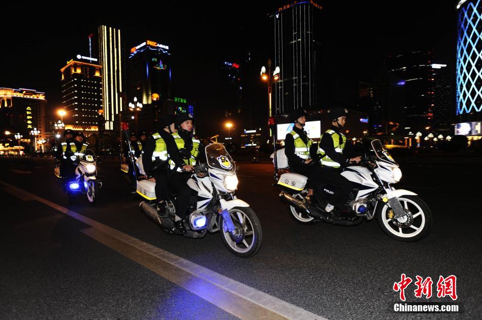 11月10日晚间,成都20000警力全警出动,打响了今年以来规模最大的集中清查行动。此次为期80天的2015“平安成都·铁拳行动”,成都警方将围绕严厉打击刑事犯罪、全力维护社会稳定、强化社会治安整治、强化社会面防控和狠抓公共安全管理5项重点任务,严厉打击影响人民群众生命财产安全的违法犯罪行为,重点打击毒品犯罪、涉枪及命案等恶性犯罪、侵财类犯罪和经济领域犯罪。图为民警街面巡逻。 中新社记者 安源 摄