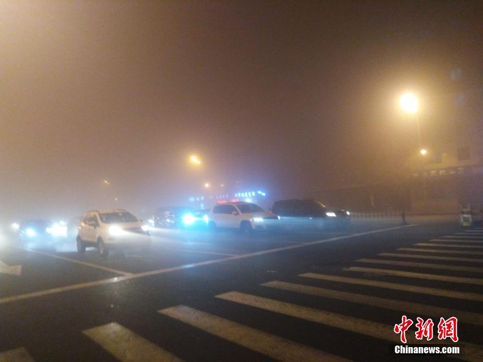11月10日夜间,一场突如其来的大雾入侵了位于中国北部的哈尔滨市,因能见度极低导致该市的太平国际机场大面积航班延误,截止目前,共有171个航班被迫取消,200个航班受到不同程度的影响,黑龙江省内多条高速公路也因大雾的原因封闭运行。图为哈尔滨街头行驶的汽车。王岩 摄
