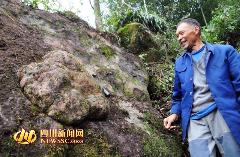 据介绍,此次发现含蜥脚类、鸟脚类和兽脚类三类恐龙脚印。通过对脚印走向和大小的细致勘察,发现了1亿年前食草恐龙成群活动的证据和分布密集的中小型肉食恐龙足迹。特别值得一提的是,足迹化石现场还出现了“庞然大物”的痕迹,其留下的脚印直径约60cm,厚度达20cm。该脚印特别巨大,令专家们震撼,属恐龙足迹的重大发现。图为巨型恐龙脚印。 图片来源:四川新闻网