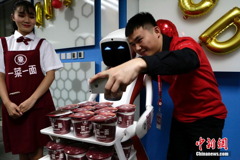 11月10日,两个机器人现身北京京东大厦,为备战双十一而加班的工作人员送上西红柿鸡蛋泡面,为加班者助力。中新社记者 李慧思 摄