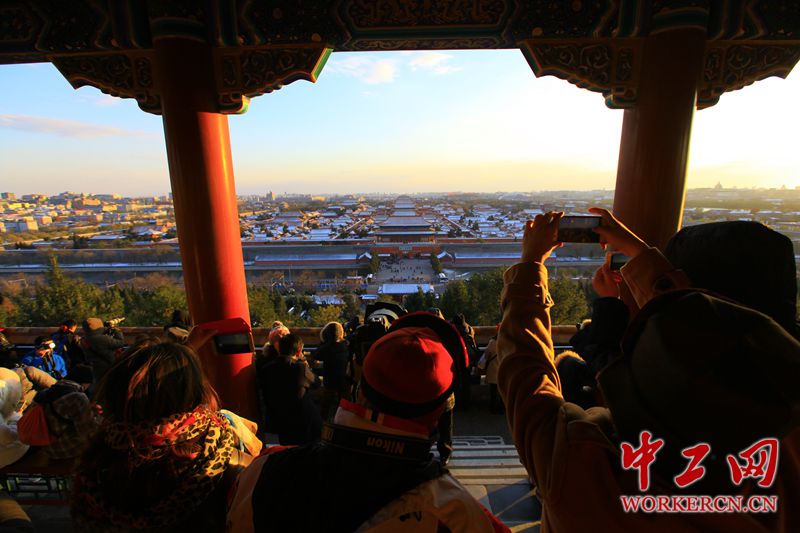 2015年11月25日,北京雪后放晴,景山公园引大批游客驻足拍照。虽然气温低下,却丝毫没有影响摄影爱好者的创作热情。中工网记者 张起晨摄
