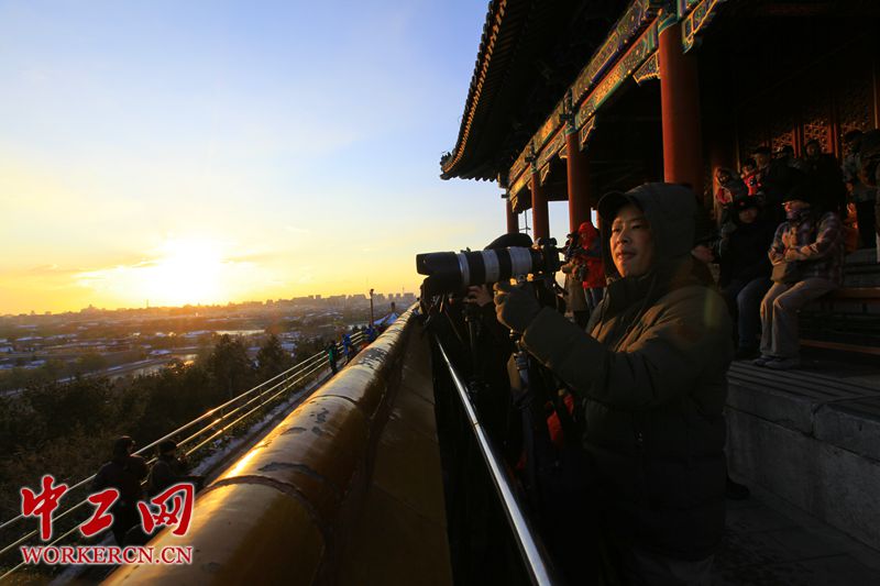 2015年11月25日,北京雪后放晴,景山公园引大批游客驻足拍照。虽然气温低下,却丝毫没有影响摄影爱好者的创作热情。中工网记者 张起晨摄