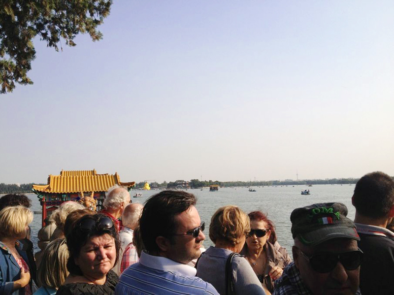 外国游客欲乘船观赏大黄鸭。 10月7日是国庆长假的最后一天,北京颐和园人山人海,国庆节前来到昆明湖的大黄鸭吸引了众多游客。 中工网记者 段瑜摄