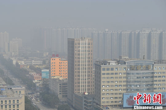 10月9日,山西太原遭遇雾霾。据当日中央气象台预报,新一股冷空气正式入侵中国,受其影响内蒙古大部气温将下降4~10℃。另外,随着天气形势趋于平稳,霾天气的势力又将有所抬头。中新社发 韦亮 摄