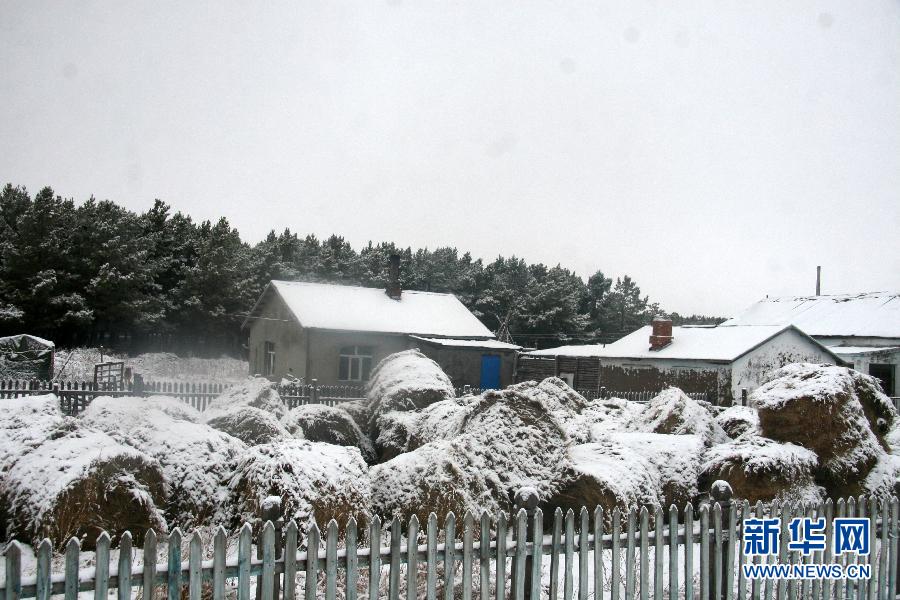 这是10月11日在内蒙古呼伦贝尔拍摄的被白雪覆盖的农舍和草料。