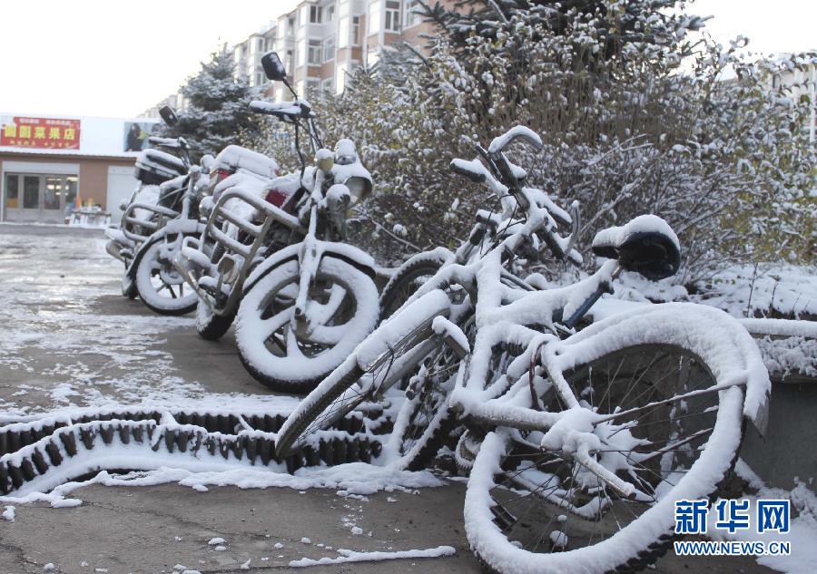 10月11日,在黑龙江省大兴安岭地区加格达奇区,一居民区内停放的车辆被白雪覆盖。