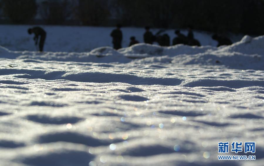 10月11日,在黑龙江大兴安岭,武警大兴安岭地区森林支队的战士在清扫积雪。