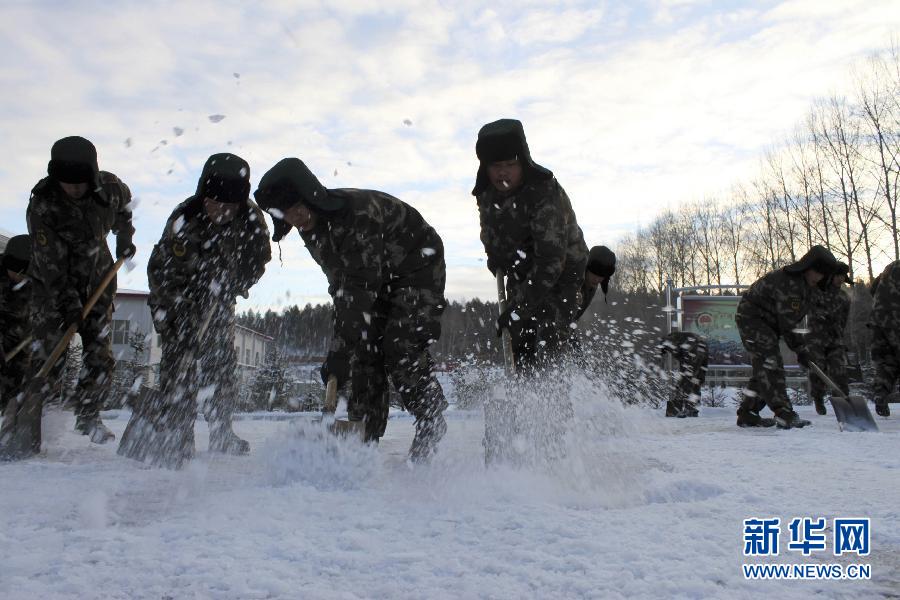 10月11日,在黑龙江大兴安岭,武警大兴安岭地区森林支队的战士在清扫积雪。