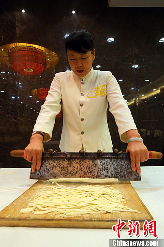 11月12日,某香港媒体记者在山西某知名面食店采访山西面食绝艺,面点师傅表演刀剥面。中新社发 张云 摄