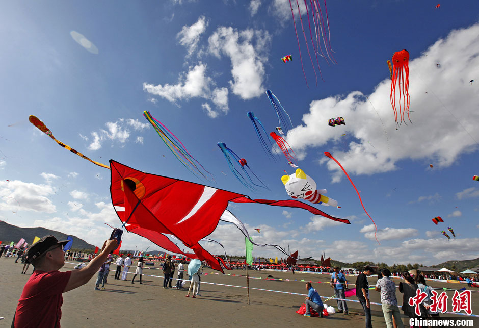10月13日,在享有“华东第一滩”美誉的浙江省舟山市岱山县岱山鹿栏晴沙景区内,2013中国·岱山国际海岛运动风筝邀请赛暨全国风筝竞标赛在此举行。当天,几百只风筝翱翔蓝天、争奇斗艳,为人们带来了一场视觉盛宴。中新社发 童世领 摄
