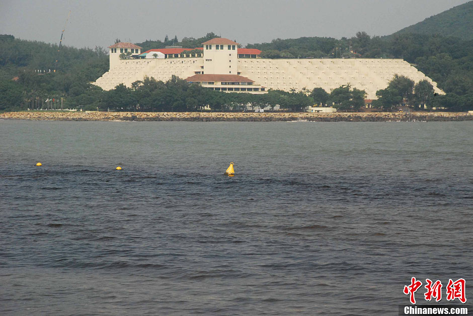 10月15日,澳门黑沙海滩泳区海水受赤潮影响无法游泳,海中深褐色赤潮带清晰可见。澳门黑沙和竹湾海滩最近一周来频现赤潮现象,影响市民和游客水上活动。中新社发 毕永光 摄