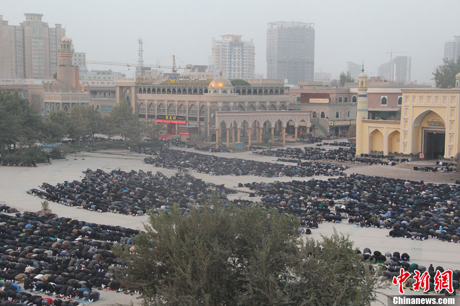 10月15日,新疆穆斯林群众迎来古尔邦节。当日北京时间9时许,新疆最大清真寺喀什艾提尕尔清真寺内外约3万穆斯林群众做礼拜参加会礼,庆祝古尔邦节的到来。图为做礼拜现场。中新社发朱景朝 摄