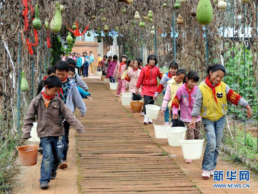 10月16日,宣威市西宁街道靖外明德小学的学生提水浇灌自己种植的蔬菜。云南省宣威市西宁街道靖外明德小学有1173名山区学生,其中留守儿童达912名。面对如此庞大的留守儿童群体,该校努力创设快乐、和谐的育人环境,对学生实行“全过程管理,全天候跟踪,全身心服务,全方位育人”的“四全管理”,积极推进素质教育,培养山区孩子的创新精神和实践能力,把学校办成学生求知强能的学园、生动活泼的乐园、充满亲情的家园。在当地政府的支持下,学校办起了自己的种养殖基地,每周开设劳动课,让孩子们在种植、养殖中认知生命、珍爱生命,在种植、养殖中了解了生活常识,学习生存技能。新华社记者杨宗友摄