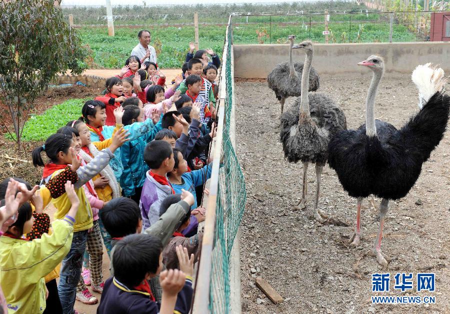 10月16日,宣威市西宁街道靖外明德小学的学生在学校动物园观赏动物。云南省宣威市西宁街道靖外明德小学有1173名山区学生,其中留守儿童达912名。面对如此庞大的留守儿童群体,该校努力创设快乐、和谐的育人环境,对学生实行“全过程管理,全天候跟踪,全身心服务,全方位育人”的“四全管理”,积极推进素质教育,培养山区孩子的创新精神和实践能力,把学校办成学生求知强能的学园、生动活泼的乐园、充满亲情的家园。在当地政府的支持下,学校办起了自己的种养殖基地,每周开设劳动课,让孩子们在种植、养殖中认知生命、珍爱生命,在种植、养殖中了解了生活常识,学习生存技能。新华社记者杨宗友摄