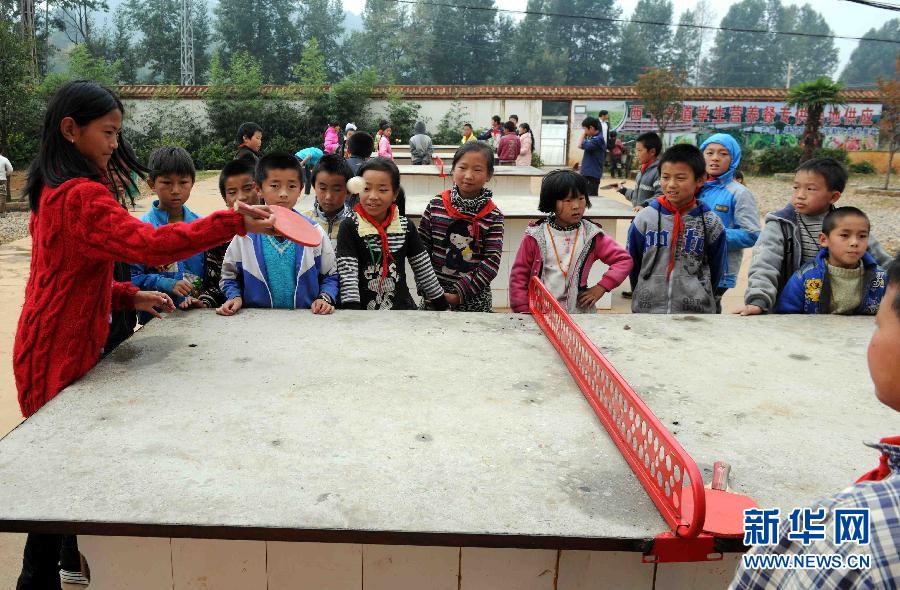 10月16日,宣威市西宁街道靖外明德小学的学生在课余时间打乒乓球。云南省宣威市西宁街道靖外明德小学有1173名山区学生,其中留守儿童达912名。面对如此庞大的留守儿童群体,该校努力创设快乐、和谐的育人环境,对学生实行“全过程管理,全天候跟踪,全身心服务,全方位育人”的“四全管理”,积极推进素质教育,培养山区孩子的创新精神和实践能力,把学校办成学生求知强能的学园、生动活泼的乐园、充满亲情的家园。在当地政府的支持下,学校办起了自己的种养殖基地,每周开设劳动课,让孩子们在种植、养殖中认知生命、珍爱生命,在种植、养殖中了解了生活常识,学习生存技能。新华社记者杨宗友摄