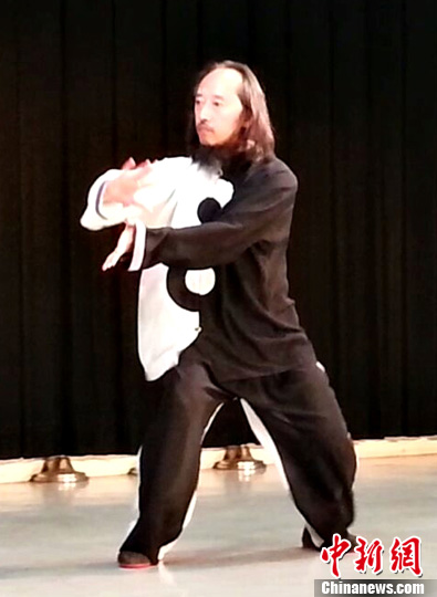 青城派掌门人刘绥滨表演青城太极。第六届海峡两岸中华武术论坛17日台北闭幕,来自海峡两岸的武术名家以武会友。在为期4天的论坛上,以博大精深的中华武术议题,发表主题演讲,探讨中华武术在两岸的传承与发展。
