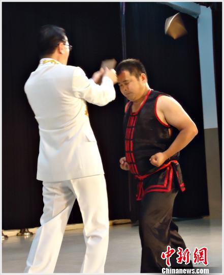 安徽合肥神行太保文武学校表演少林派铁头功-头断钢板。第六届海峡两岸中华武术论坛17日台北闭幕,来自海峡两岸的武术名家以武会友。在为期4天的论坛上,以博大精深的中华武术议题,发表主题演讲,探讨中华武术在两岸的传承与发展。