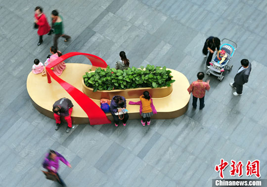 10月19日,沈阳市民在巨型“拖鞋”上休息。当日,在沈阳某商场内摆放了一双巨型“拖鞋”外型的休息座椅,奇特的造型吸引市民一坐。中新社发 于海洋 摄