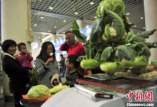 10月19日,市民品尝绿色蔬菜。当日,在济南举办的第二届中国山东国际农产品交易会上,各种绿色有机食品成为参观者抢购对象,有机馒头、绿色蔬菜等展位前人流络绎不绝,参观者纷纷上前品尝、购买。中新社发 张勇 摄