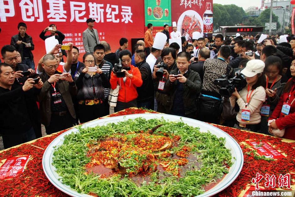 10月19日,第二十三届中国厨师节在湖南长沙举行。中国湘菜大师许菊云率团队将一条长1.4米、重102斤的罕见有机鳙鱼(雄鱼,单鱼头约重50斤)现场宰杀,烹制成“双色双味剁椒鱼头”,并申创吉尼斯纪录。图为超级剁椒鱼头引围观。唐小晴 摄